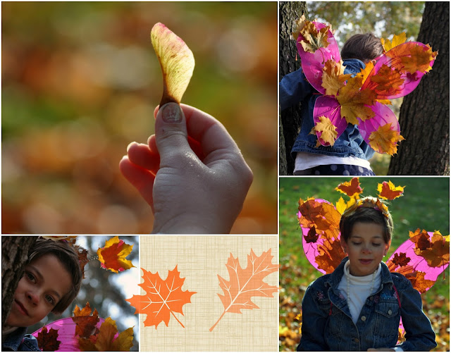 slunce…mýt fialová křidélka motýla, která maminka polepila podzimními listy….